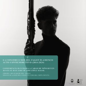 LA CONSTRUCCIÓN DEL FAGOT FLAMENCO (2014-2024), un acto conmemorativo que incluirá las intervenciones de Vicente Cantero y Antonio Gómez, una pequeña conferencia a cargo de Niño Ruven y una muestra musical acompañada por el baile de Víctor López Mayol. Será un encuentro único e íntimo que tendrá lugar en el Molino de Aceite del Conjunto Vergara a partir de las 20:00 h.