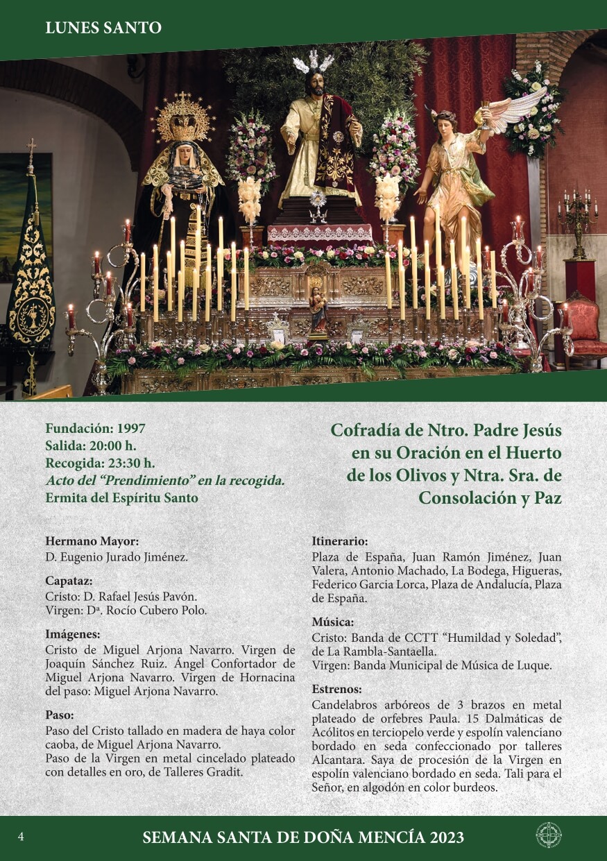 La Cofradía del Stmo. Cristo Amarrado a la Columna de Doña Mencía fue fundada en junio de 1980, cuando un grupo de jóvenes decide crear una cofradía alrededor de la Imagen del Cristo de la Columna, adquirida en 1940 por Luis Amores, y que había procesionado anteriormente durante 40 años sin hermandad propia. Elementos a destacar en la Cofradía son sus figuras bíblicas, que representan a personajes del Sanedrín y autoridades romanas y judías, y que realizan el acto del Lavatorio de Manos de Pilato durante la estación de penitencia del Jueves Santo. Otra característica particular de la cofradía es su banda de tambores y timbales, con marchas propias y singulares. Cabe destacar también el andar del paso de Cristo, donde costaleros y banda de cornetas conjuntan movimiento y marcha.