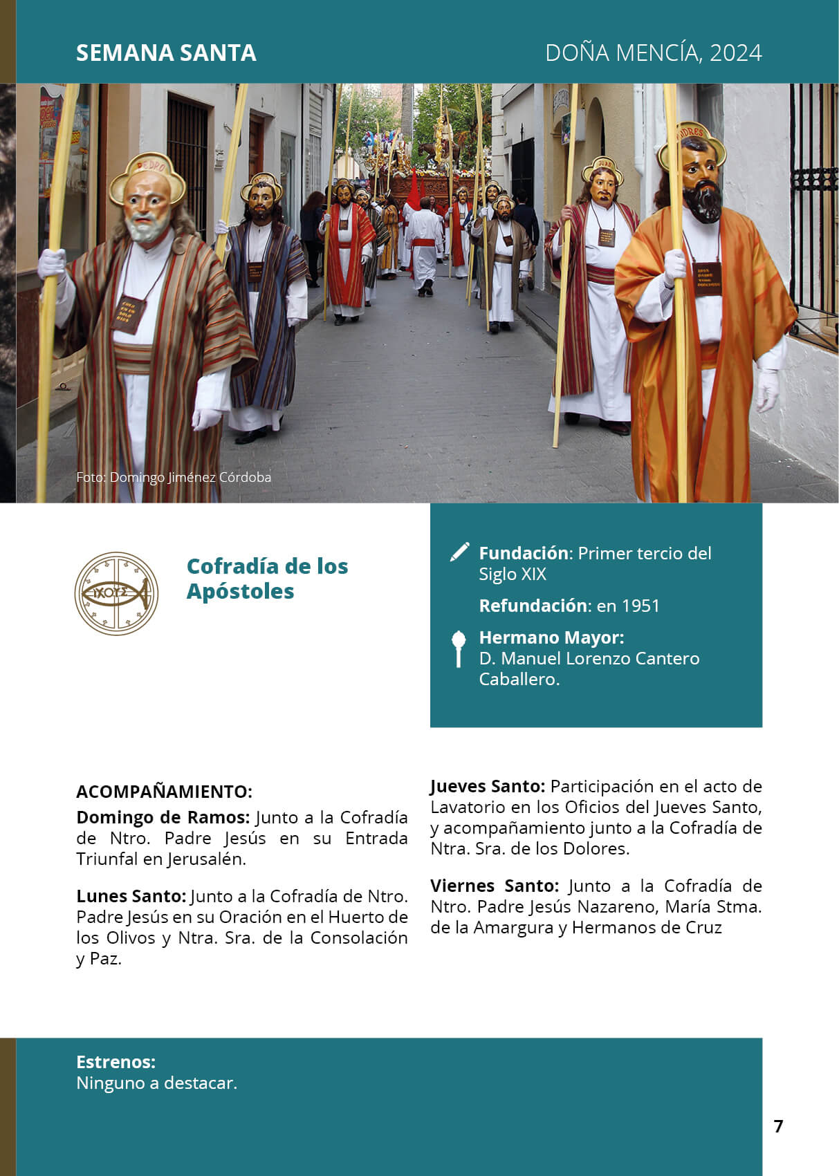 La fundación de la Cofradía de los Apóstoles data del primer tercio del siglo XIX. Después de la guerra civil española y durante la década de los años cuarenta del siglo XX tiene una etapa de decadencia. En 1.951 es refundada por Lorenzo Cantero Urbano y desde esta fecha hasta la actualidad. Tradicionalmente ha acompañado el Jueves Santo, primero al Cristo de la Columna y posteriormente a la Virgen de los Dolores. Y el Viernes Santo a Jesús Nazareno. Desde la fundación de la Cofradía del Señor del Huerto lo acompaña el Lunes Santo. Y más recientemente también lo hace al Señor de la Borriquita el Domingo de Ramos.